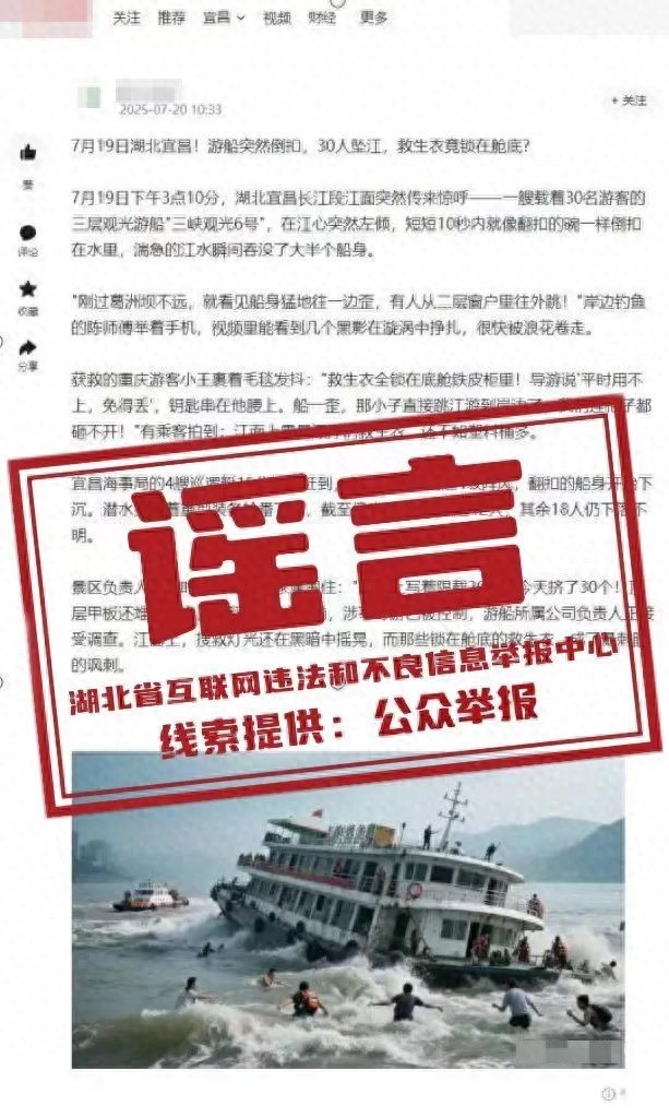 近日,有网民发布“湖北宜昌游船突然倒扣,30人坠江”的图文信息。经海事部门核实,网传信息系谣言。